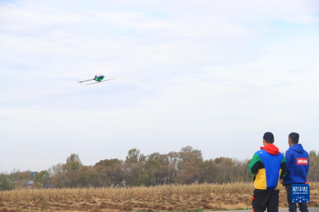 10月13日,在2021中國國際飛行器設計挑戰賽總決賽開幕式上,直升機航模進行3D花式飛行表演。新華社記者 楊青 攝