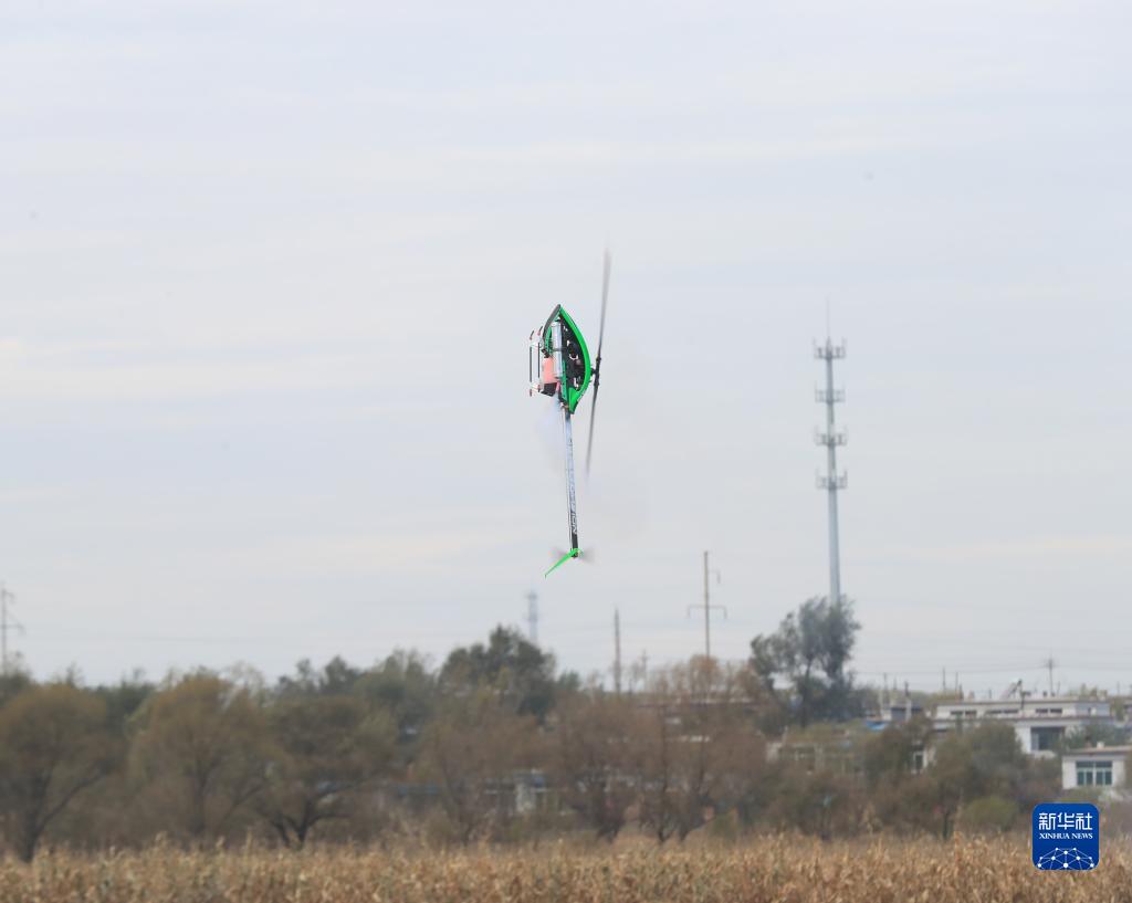 10月13日,在2021中國國際飛行器設計挑戰賽總決賽開幕式上,直升機航模進行3D花式飛行表演。新華社記者 楊青 攝