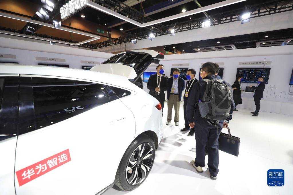 這是10月18日在2021全球工業互聯網大會華為技術有限公司展區拍攝的賽力斯華為智選SF5電動汽車。新華社記者 楊青 攝