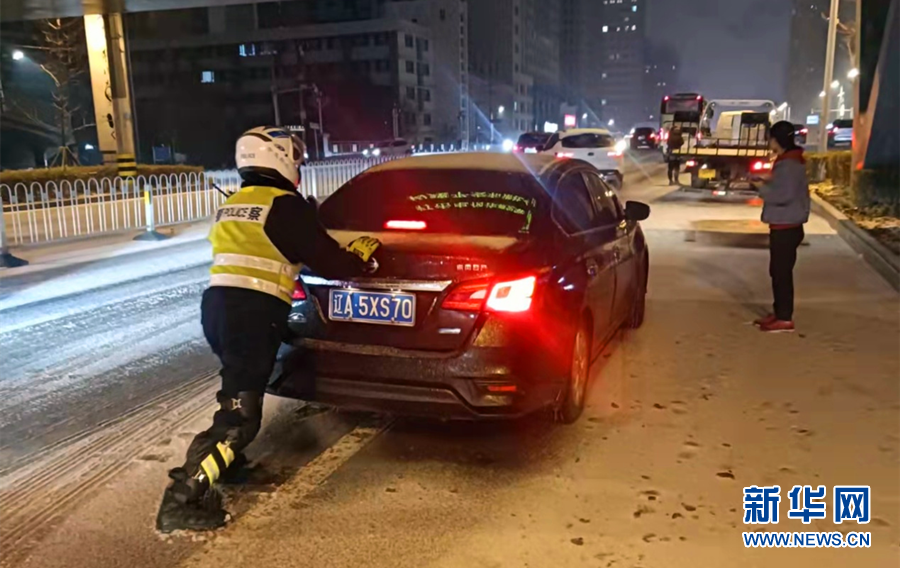 圖為執勤民警幫助車主將故障車輛推至路邊安全區域。新華網發