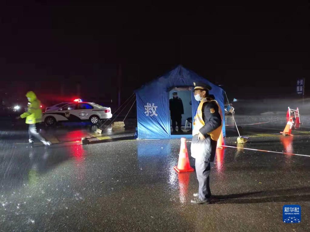 7日晚,公安、城管等隊伍在莊河市道路卡點冒雨值守。(受訪者供圖)