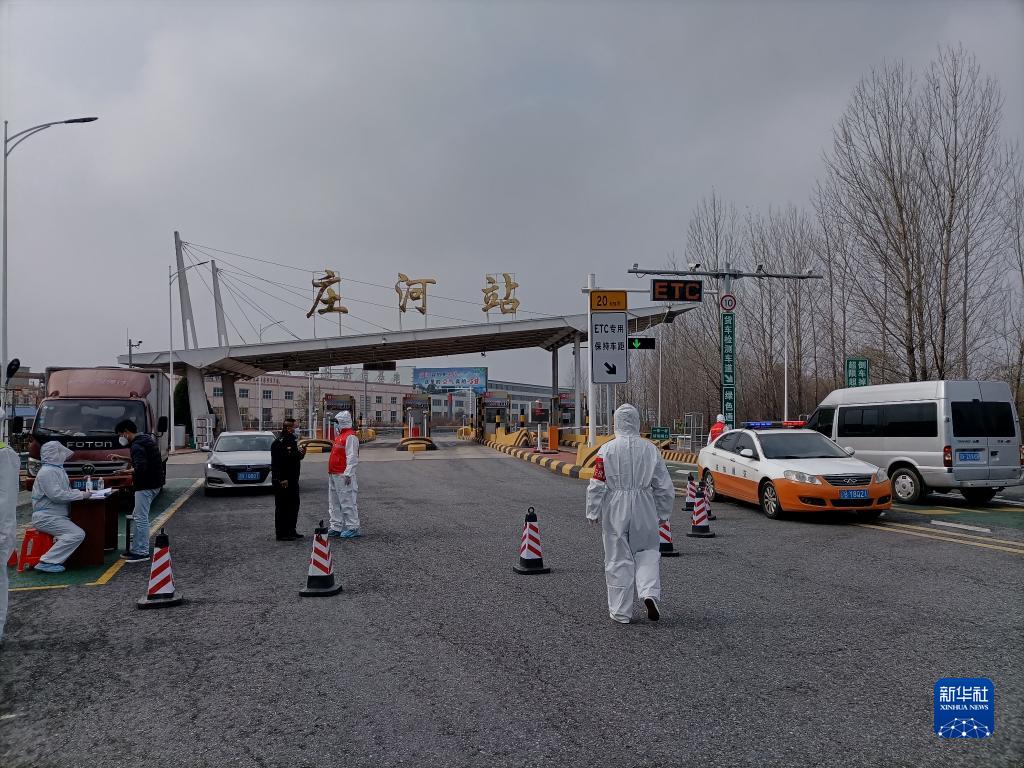 7日,身穿防護服的工作人員在高速公路莊河站出入口值守。(新華社記者 蔡擁軍 攝)
