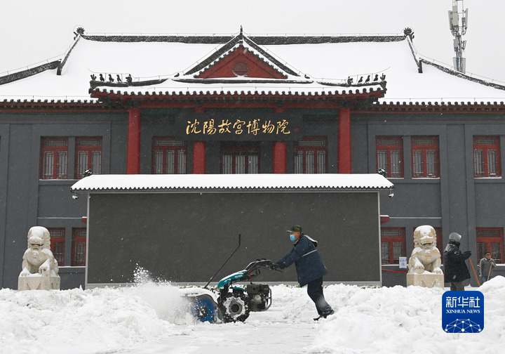 2021年11月8日,沈陽出現暴雪天氣,在沈陽市沈河區的沈陽故宮門前,保潔人員在清理積雪。 新華社記者 蔡湘鑫 攝