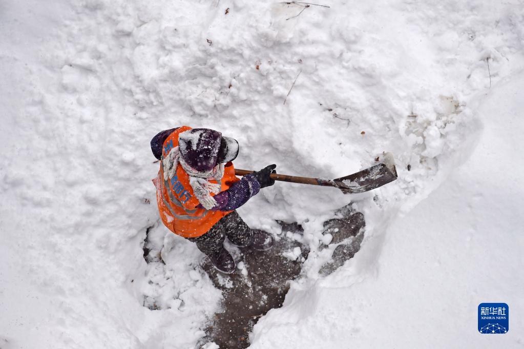 11月9日,本溪市環衛工人在清理積雪。新華社發(林林攝)