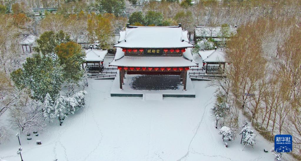 11月9日拍攝的渾河岸邊沈水灣公園內的云飏閣雪景(無人機照片)。新華社記者 楊青 攝