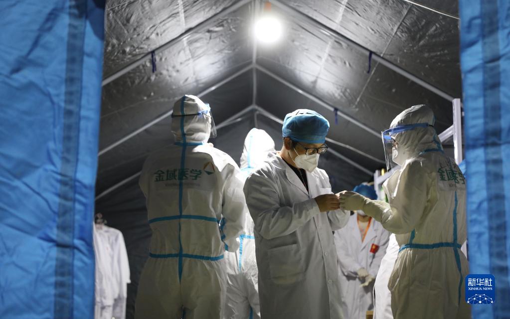 11月15日,大連方艙核酸檢測實驗室工作人員在更衣室內準備。新華社記者 姚劍鋒 攝