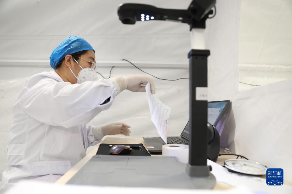 11月15日,大連方艙核酸檢測實驗室工作人員在擴增區錄入檢測數據。新華社記者 姚劍鋒 攝