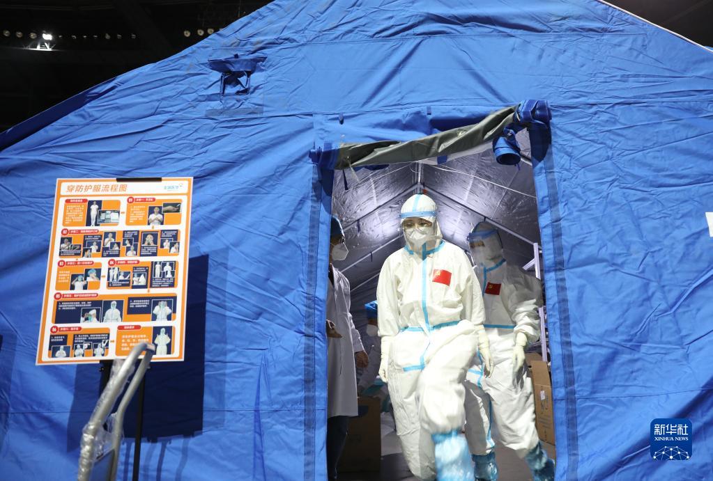 11月15日,大連方艙核酸檢測實驗室工作人員走出更衣室準備進入實驗室。新華社記者 姚劍鋒 攝