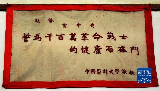 1945年,中國醫科大學師生為中共七大制作的錦旗懸掛于七大會場,現存于延安歷史博物館。(中國醫科大學供圖)
