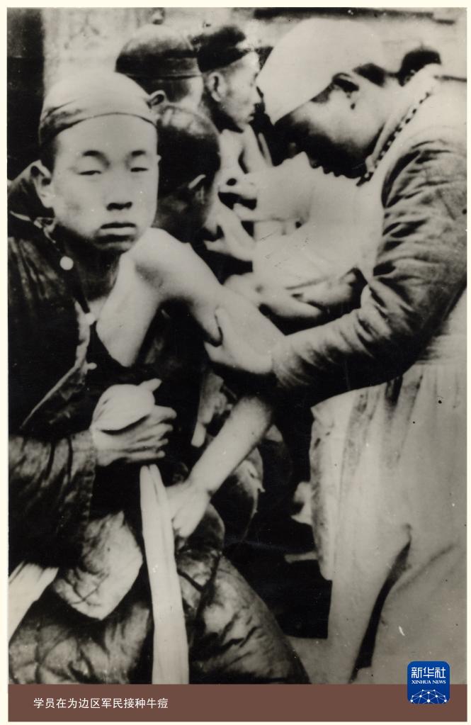 中國醫科大學學員在為邊區軍民接種牛痘疫苗。(中國醫科大學供圖)