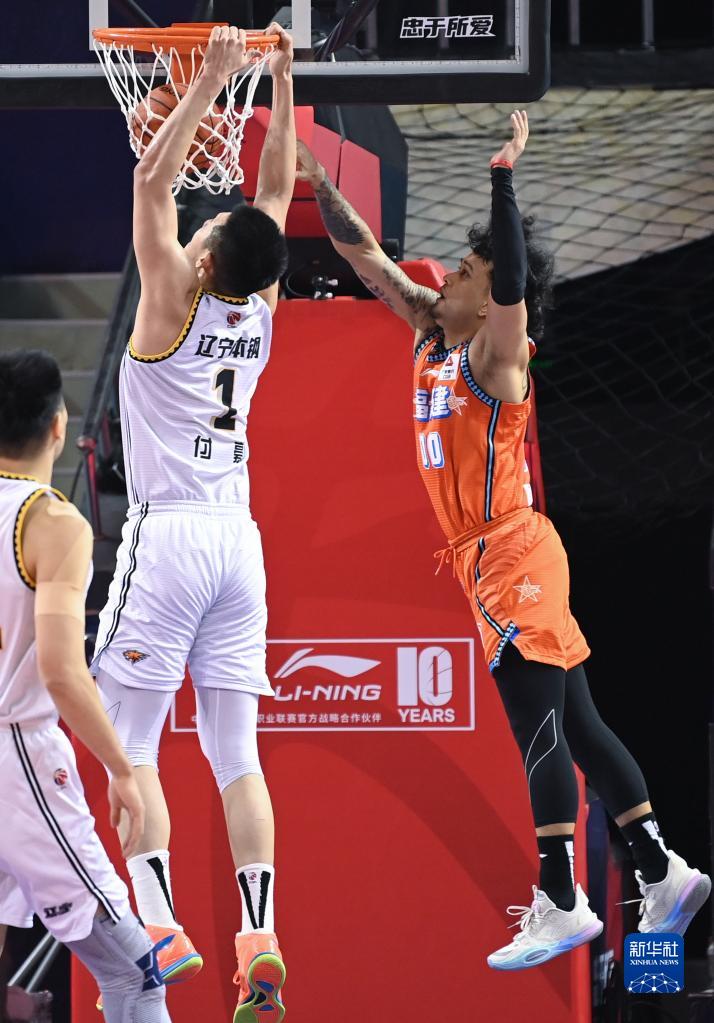 1月15日,福建潯興股份隊球員阿迪力(右)防守遼寧本鋼隊球員付豪的扣籃。當日,在吉林長春進行的2021-2022賽季中國男子籃球職業聯賽(CBA)第二階段第23輪比賽中,福建潯興股份隊以83比109不敵遼寧本鋼隊。新華社記者 顏麟蘊 攝