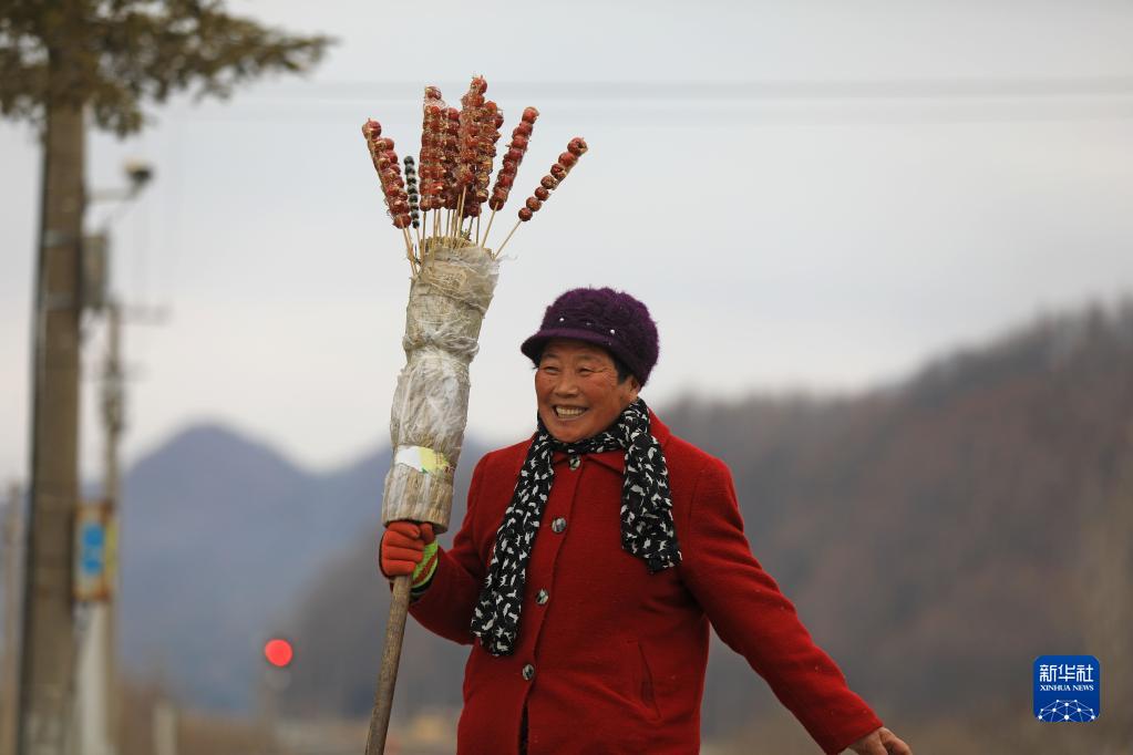 1月15日,在遼寧省鳳城市石城站,一位農民帶著自制的糖葫蘆準備上車。新華社記者 楊青 攝