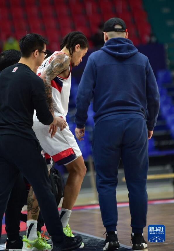 1月18日,時代中國廣州隊球員梅森(中)在比賽中受傷離場。