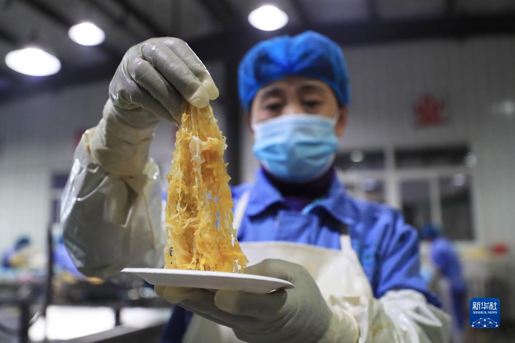 1月10日,鞍山市千山區湯崗子村村辦酸菜廠的工作人員展示切好的酸菜絲。新華社記者 楊青 攝