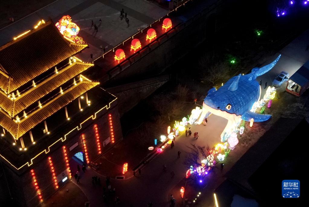 2月2日拍攝的2022中國沈陽迎春燈會上的花燈(無人機照片)。新華社記者 楊青 攝