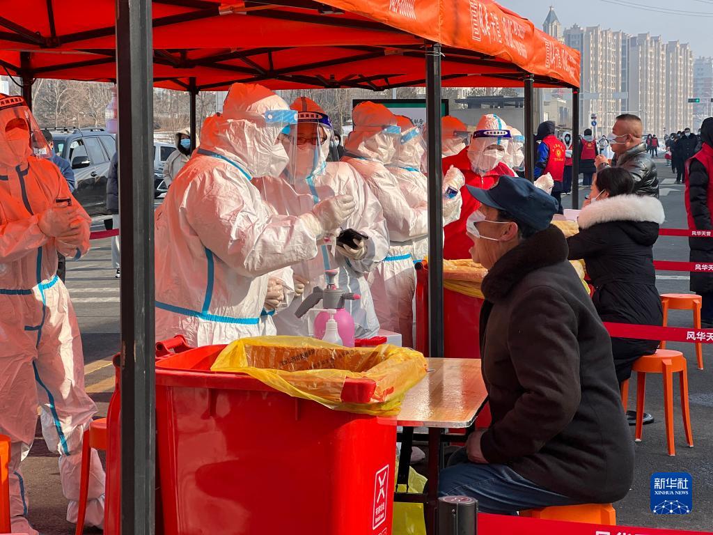 2月11日,在綏中縣綏中鎮風華里小區,居民在進行核酸檢測采樣。新華社發