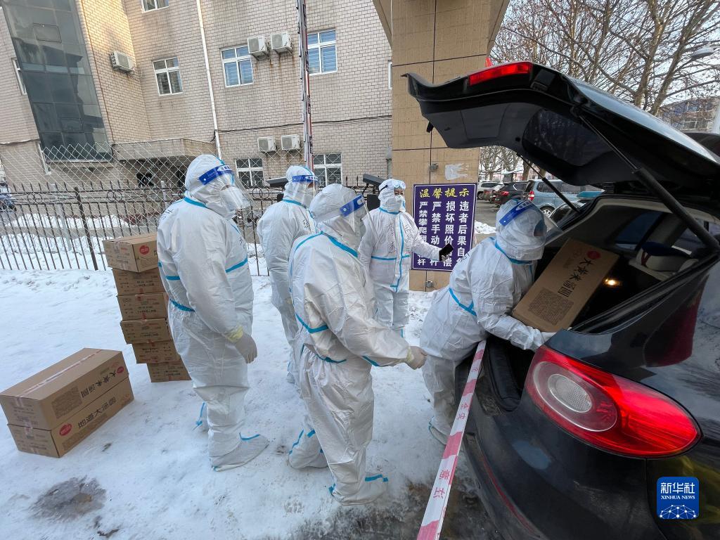 遼寧省葫蘆島市綏中縣農電小區的防疫人員在搬運為小區居民準備的湯圓。(新華社記者李昂攝)