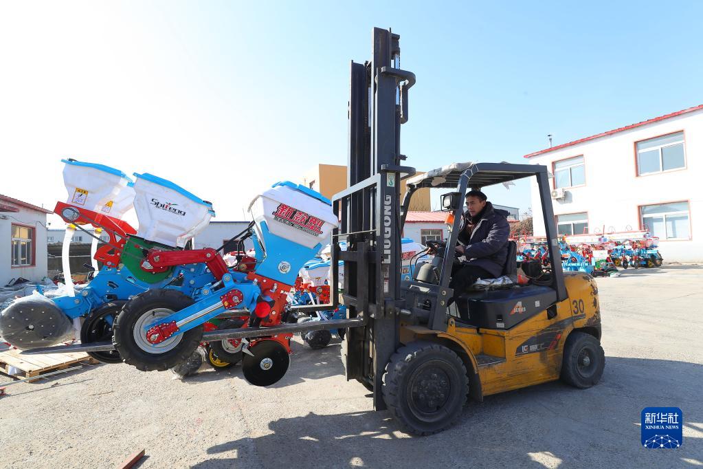 2月23日,在鐵嶺縣遼寧實豐機械有限公司,工人在搬運玉米播種機。新華社記者 楊青 攝