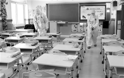 工作人員正在對教室消毒。張文魁 攝