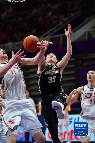 3月5日,遼寧本鋼隊球員鄢手騏(中)在比賽中爭搶籃板。當日,在遼寧沈陽進行的2021-2022賽季中國男子籃球職業聯賽(CBA)第三階段第31輪比賽中,浙江稠州金租隊以97比96戰勝遼寧本鋼隊。新華社記者 楊青 攝