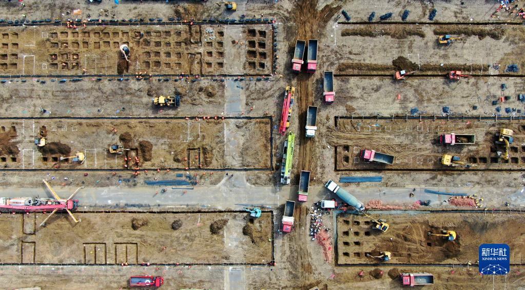 3月22日,在沈陽國際展覽中心,各施工單位加緊建設健康驛站(無人機照片)。新華社記者 楊青 攝