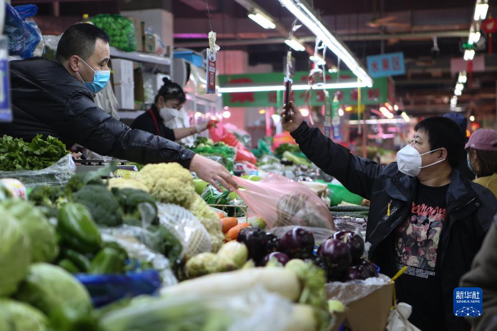3月25日,在沈陽市鳳祥綜合市場,一名市民買菜后掃碼付款。