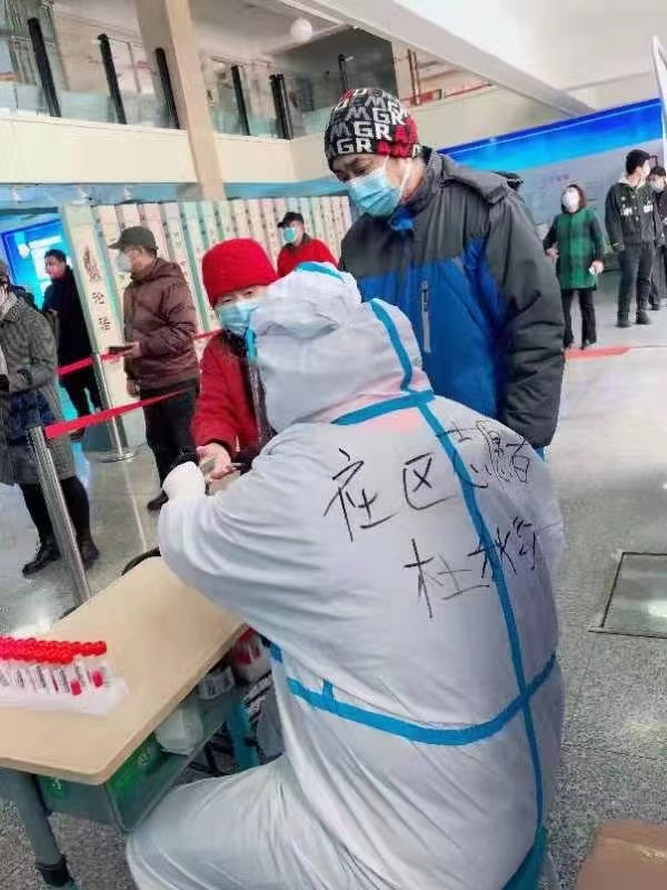 3月22日早8時,33歲的杜秋紅準時“上崗”,配合檢測點位的醫護人員分檢測管、為居民掃描健康碼,協助社區工作者維持人群秩序、為居民發放核酸檢測卡。就這樣,一口水沒顧得上喝的她,一直忙碌到傍晚。