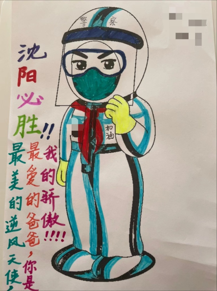 “爸爸真厲害,我畫個爸爸吧!給他戴上紅領巾?!便隼牙咽謾C里李林穿著防護服執勤時的照片,認真地畫著,涂好顏色后,又一筆一畫地寫下:“最美的逆風天使,最愛的爸爸,你是我的驕傲!沈陽必勝!”