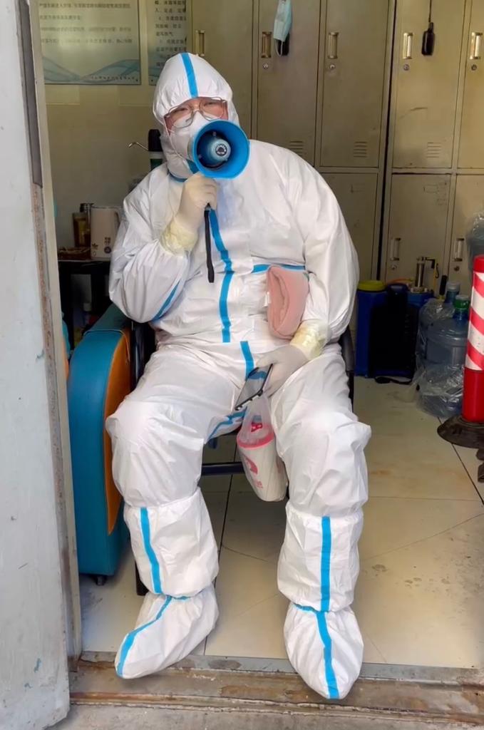 圖為周啟明在用大喇叭向居民宣傳核酸檢測。(受訪者供圖)