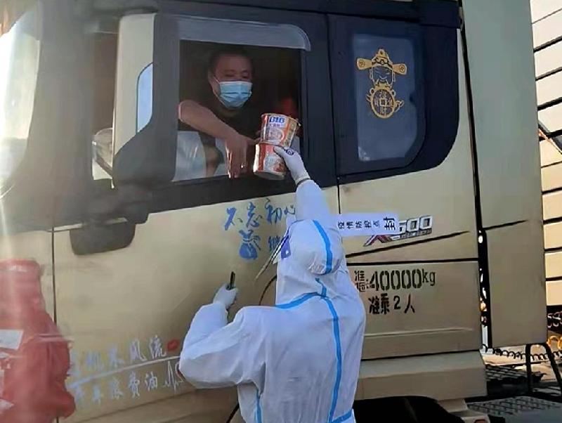 沈陽市鐵西區張士高速口的工作人員為貨車司機送去食品。(沈陽市鐵西區宣傳部供圖)