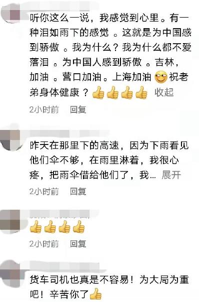 “貨車司機辛苦了,感謝你們不遠千里為沈陽人民送來的菜”“給你點贊,我們共同加油,讓疫情早點結束”“剛剛在那下的高速,在高速停了兩天餓了兩天,一下高速收到工作人員給的吃的,太感動了”……在于慶春的視頻下方,一條條留言傳遞著大家攜手戰“疫”的溫度。