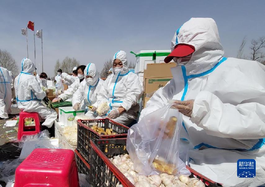 在中國供銷農產品(沈陽)集配中心,沈撫新區機關干部和社區志愿者在分揀蔬菜(4月5日攝)。新華社發