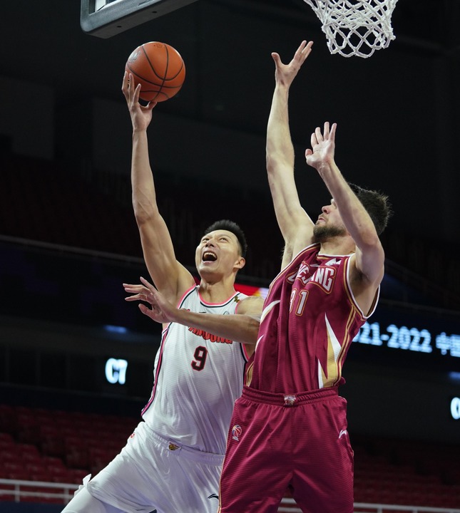 4月9日,廣東隊球員易建聯(左)在比賽中上籃。新華社記者胡晨歡攝