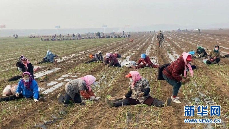 在海城市望臺鎮瑞亞蔬菜合作社圓蔥生產基地,近300名村民正栽植圓蔥苗。據悉,1100萬株紅博、托塔娜等品種的圓蔥苗子計劃4月15日前后栽植完成。
