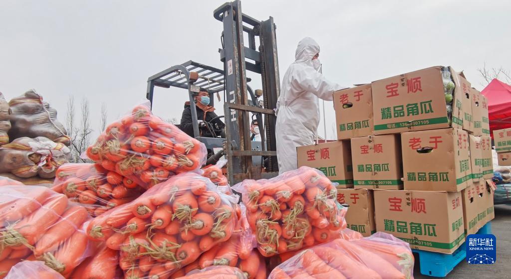 4月11日,在中國供銷農產品(沈陽)集配中心,沈撫改革創新示范區志愿者在搬運蔬菜。新華社發