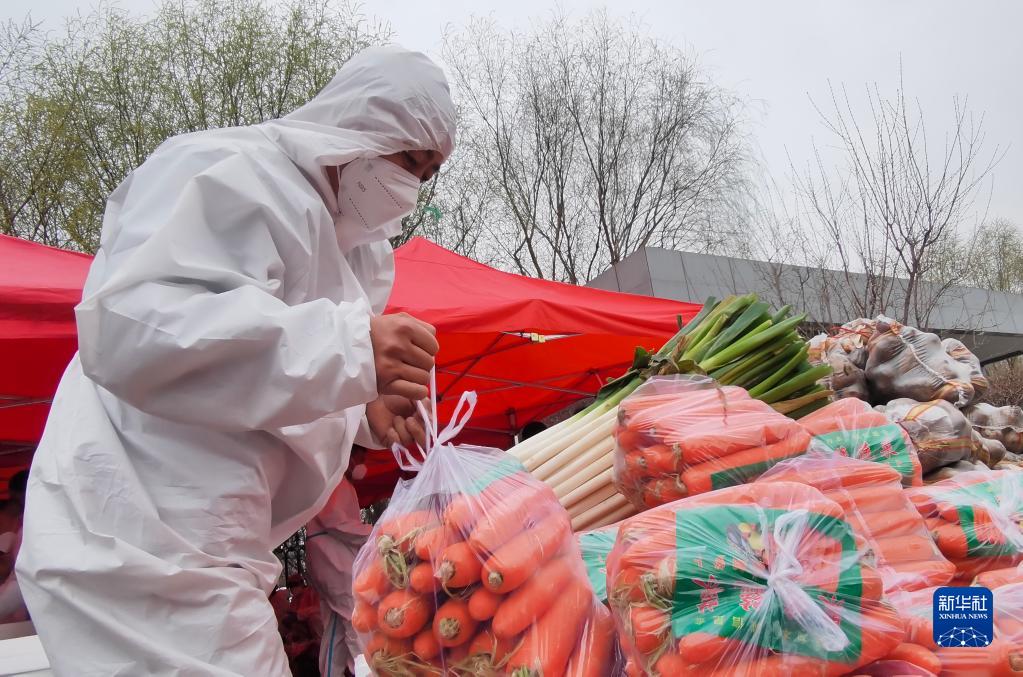4月11日,在中國供銷農產品(沈陽)集配中心,沈撫改革創新示范區志愿者在分揀蔬菜。新華社發