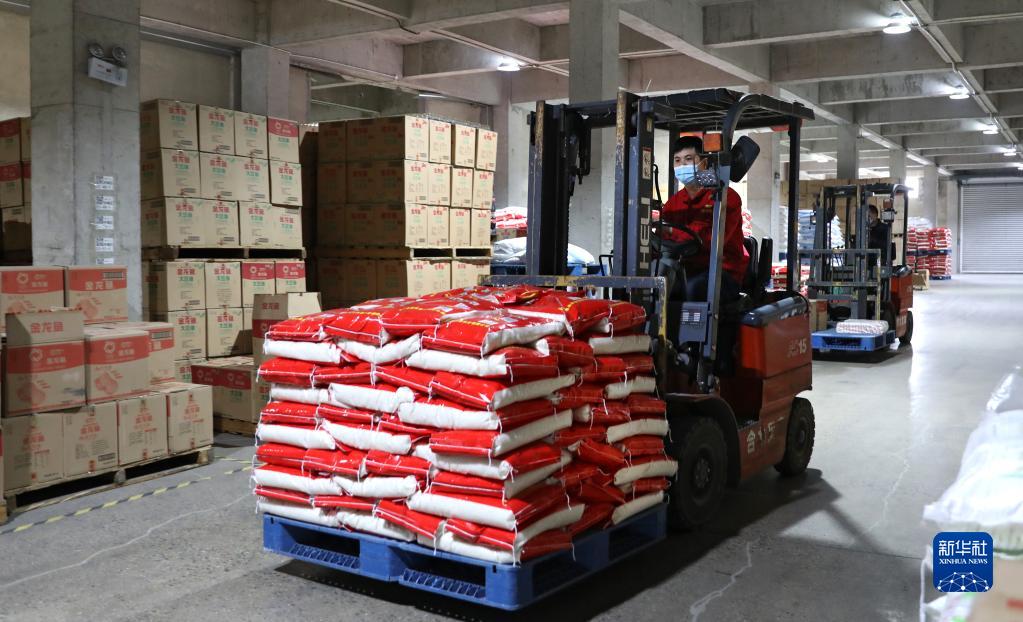 4月20日,工人在鞍山宏業恒大商貿有限公司倉庫內運輸保供糧品。新華社記者 姚劍鋒 攝