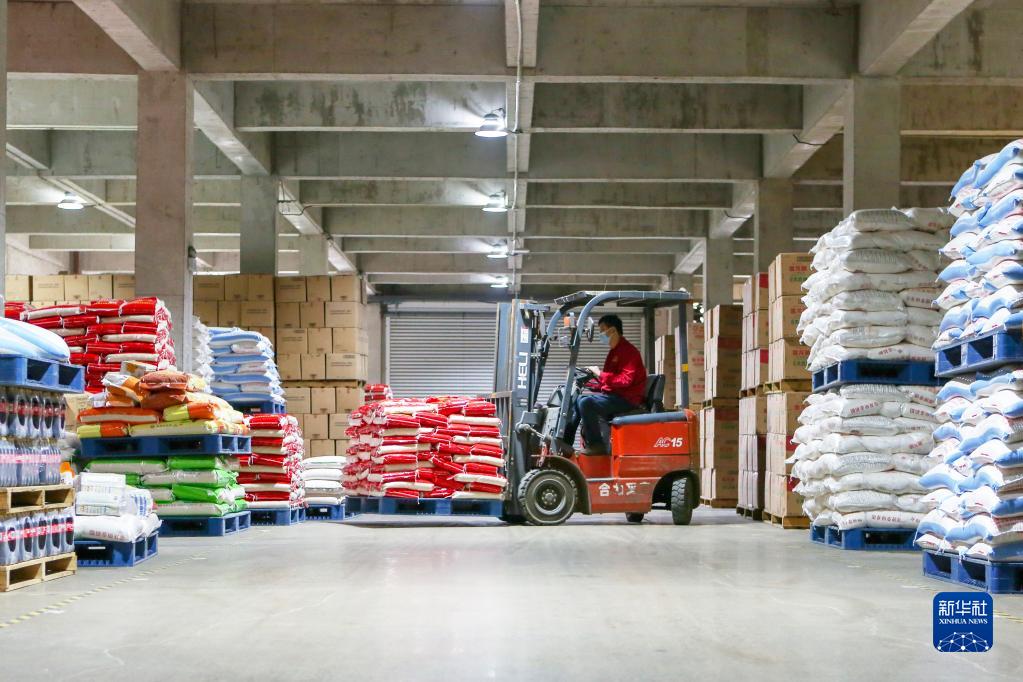 4月20日,工作人員在鞍山一家商貿有限公司倉庫內運輸保供糧品。新華社記者 王乙杰 攝