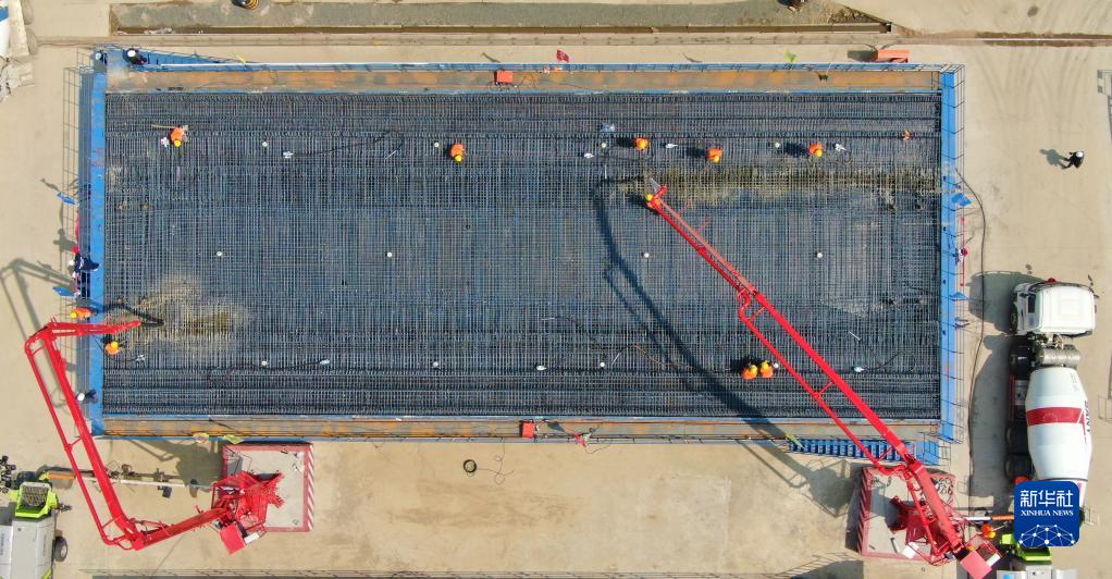 4月20日,在中鐵九局沈白高鐵蘭山制梁場內,中鐵九局工程技術人員在澆筑箱梁(無人機照片)。新華社記者 楊青 攝