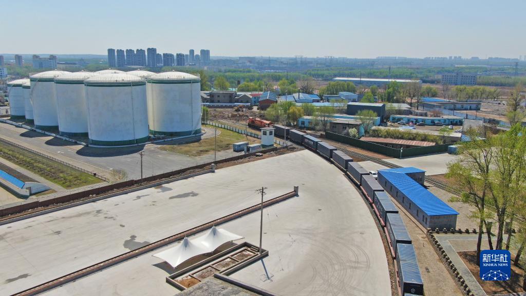 4月22日,遼寧首趟中老鐵路國際貨運列車正式開行(無人機照片)。新華社記者 楊青 攝