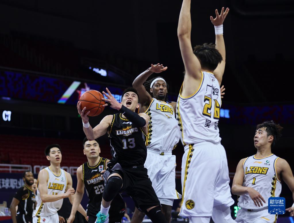 4月24日,遼寧本鋼隊球員郭艾倫(左三)在比賽中上籃。新華社發