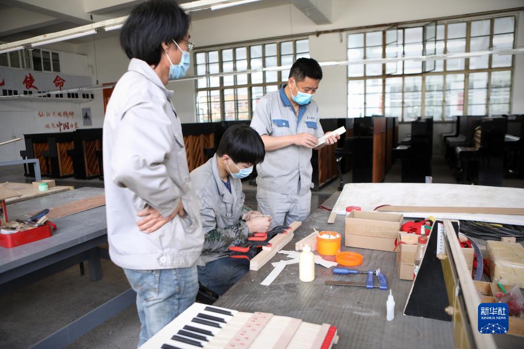 4月26日,劉玉磊(右)和他的師父郭凱(左)以及劉玉磊的徒弟孫義澤在車間解決鋼琴部件問題。新華社記者 王乙杰 攝