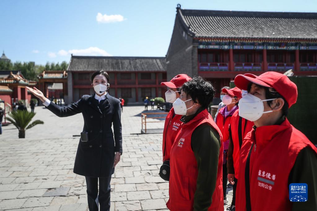 5月1日,曾奮戰在社區防疫一線的志愿者在講解員的引導下參觀沈陽故宮博物院。新華社記者 潘昱龍 攝