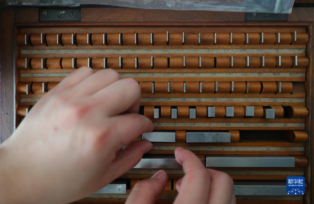 在沈陽飛機工業(集團)有限公司方文墨工作室,青年工人楊國心在挑選量塊(4月19日攝)。新華社記者 楊青攝