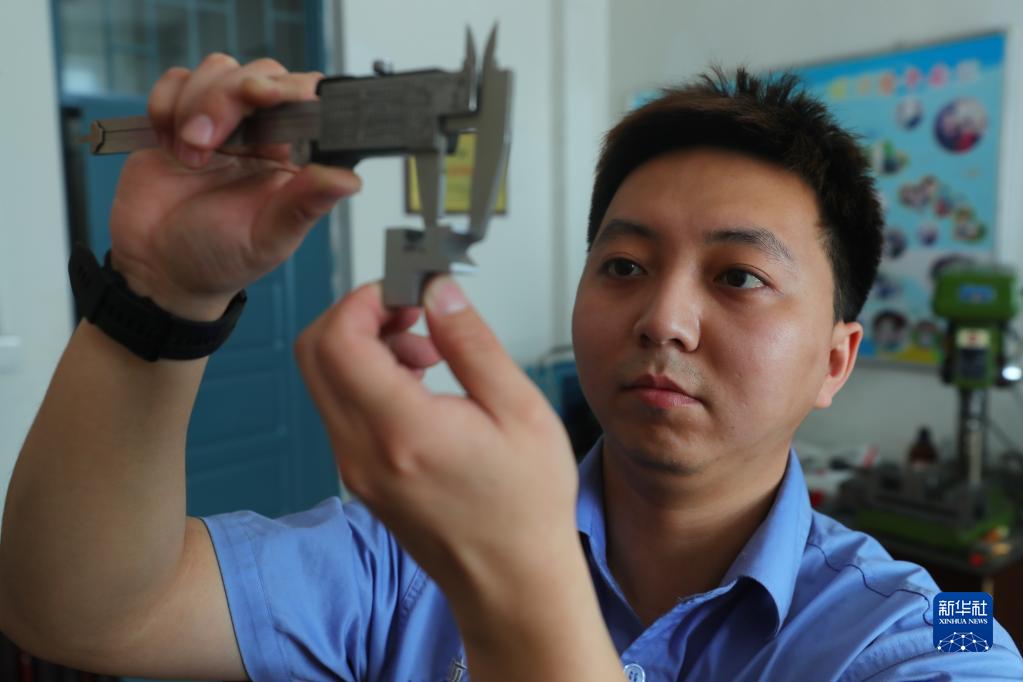 在沈陽飛機工業(集團)有限公司方文墨工作室,青年工人楊國心在測量飛機零部件(4月19日攝)。新華社記者 楊青攝