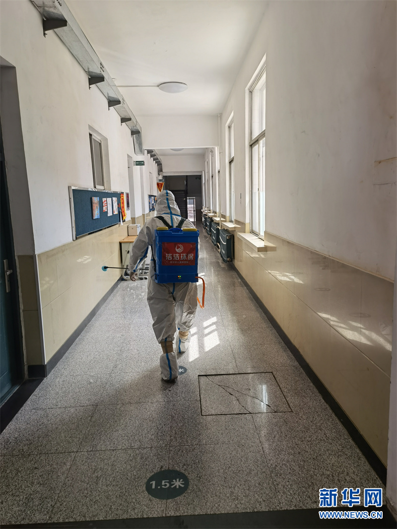 為確保學生在校期間安全,師生入校前,沈陽鐵路實驗中學安排專人對校園進行消殺。新華網發