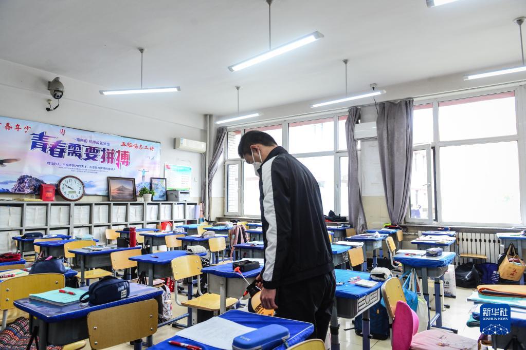 5月6日,沈陽市第七中學初三(5)班的老師在教室內消毒。由于疫情原因,3月14日,沈陽市中小學暫停線下教學活動,改為線上教學。近期沈陽市疫情防控形勢持續向好,按照科學精準防控和分批有序返校復學的原則,5月6日起,沈陽市普通高中三年級、初中三年級恢復線下教學。新華社發