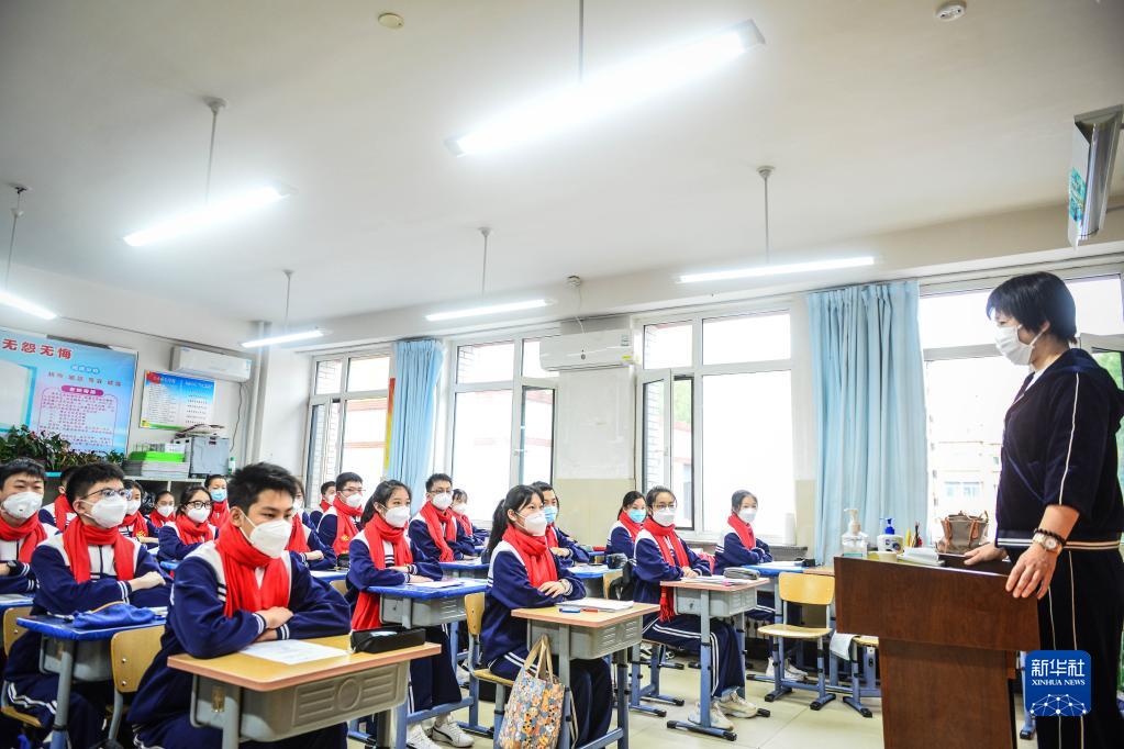 5月6日,沈陽市第七中學初三(11)班的老師為學生上課。由于疫情原因,3月14日,沈陽市中小學暫停線下教學活動,改為線上教學。近期沈陽市疫情防控形勢持續向好,按照科學精準防控和分批有序返校復學的原則,5月6日起,沈陽市普通高中三年級、初中三年級恢復線下教學。新華社發