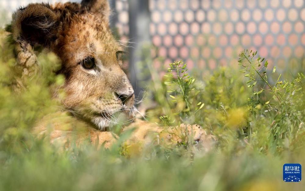 5月6日,幼獅在戶外活動玩耍。近日,沈陽怪坡東北虎園一只剛滿兩個月的人工繁育非洲獅幼獅,在經歷斷奶期后與游客見面,萌態可掬惹人喜愛。新華社記者 姚劍鋒 攝
