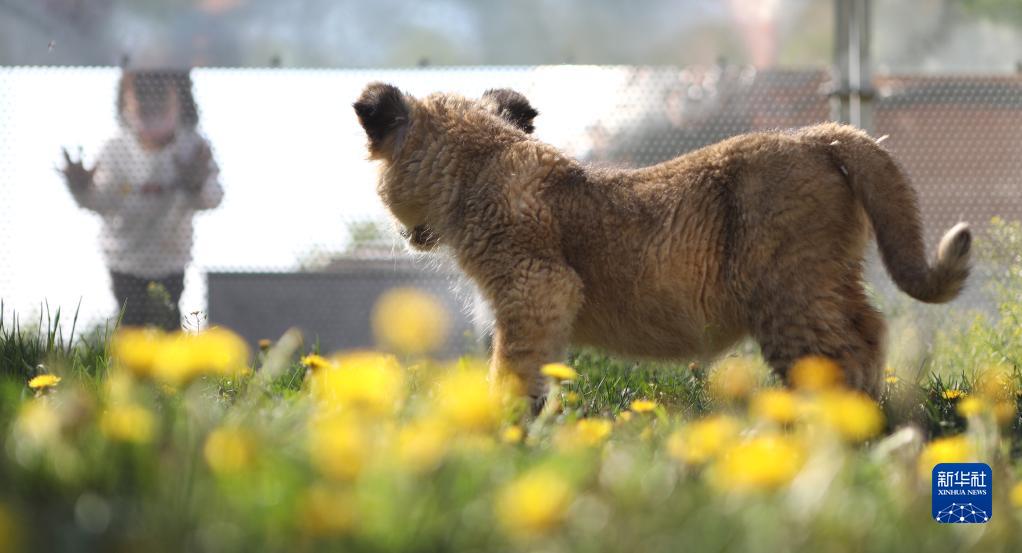 5月6日,在戶外活動玩耍的幼獅與小游客見面。近日,沈陽怪坡東北虎園一只剛滿兩個月的人工繁育非洲獅幼獅,在經歷斷奶期后與游客見面,萌態可掬惹人喜愛。新華社記者 王乙杰 攝